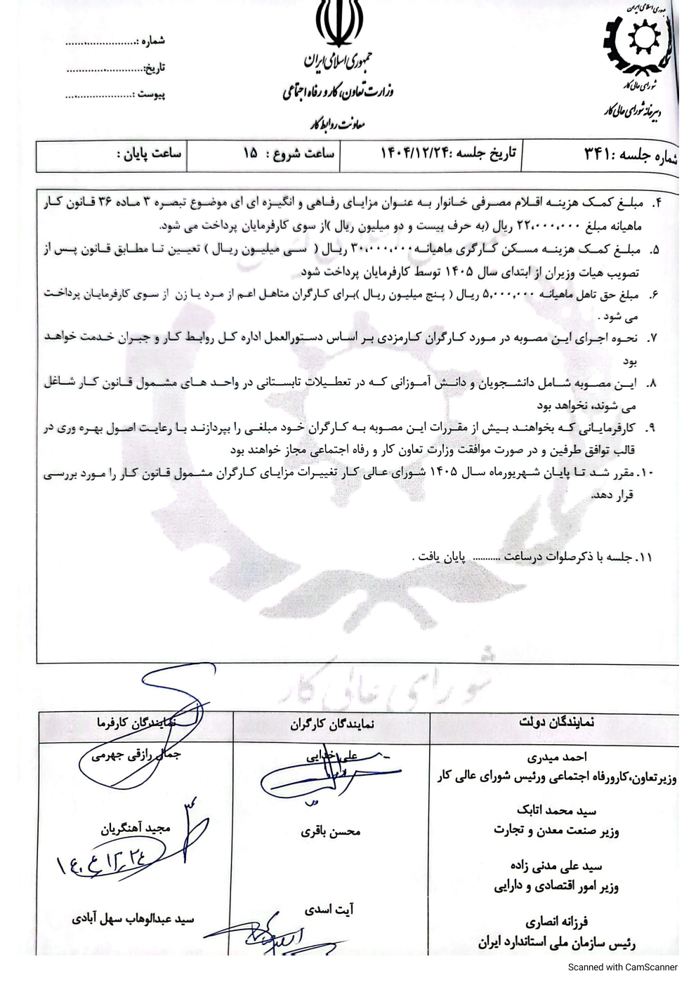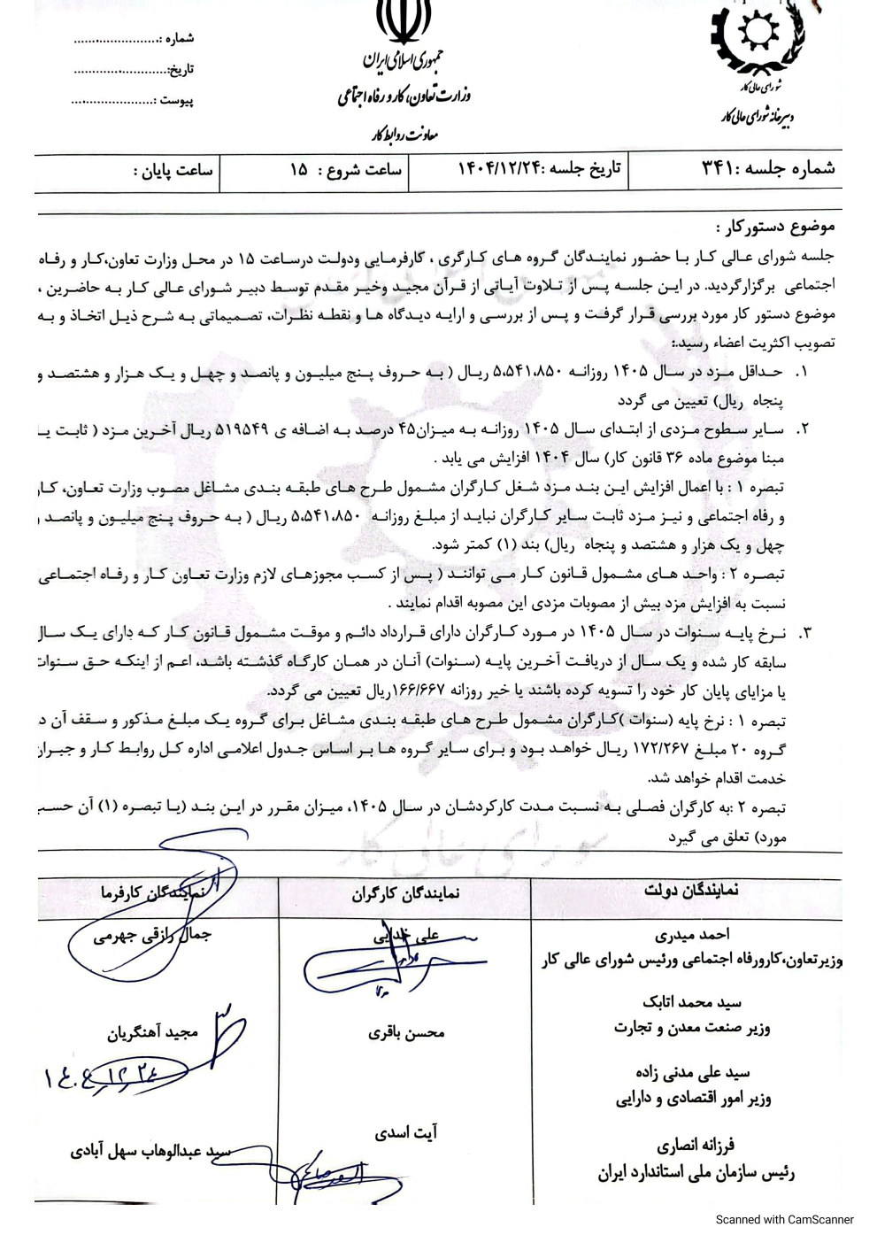 شورای عالی کار با حضور نمایندگان سه گروه (دولت، کارفرمایان و کارگران) در جلسه مورخ ۱۴۰۴/۱۲/۲۴ پس از بحث و بررسی راجع به تعیین حداقل مزد سال ۱۴۰۵ در اجرای ماده (۴۱) قانون کار موارد زیر را به اجماع و اتفاق آرا مورد تصویب قرار داد.